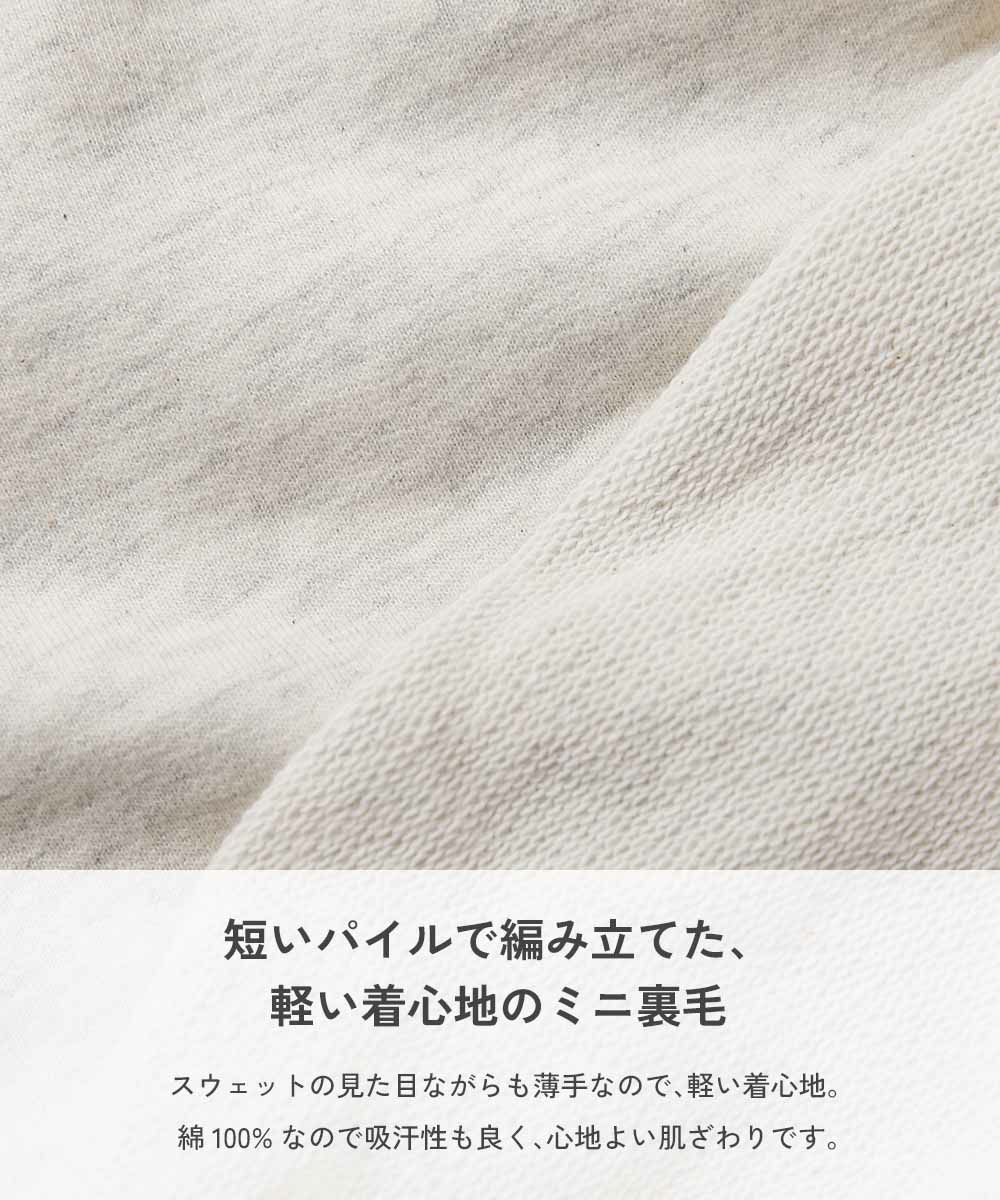 短いパイルで編み立てた、軽い着心地のミニ裏毛 スウェットの見た目ながらも薄手なので、軽い着心地。 綿100%なので吸汗性も良く、心地よい肌ざわりです。 伸縮性:ふつう