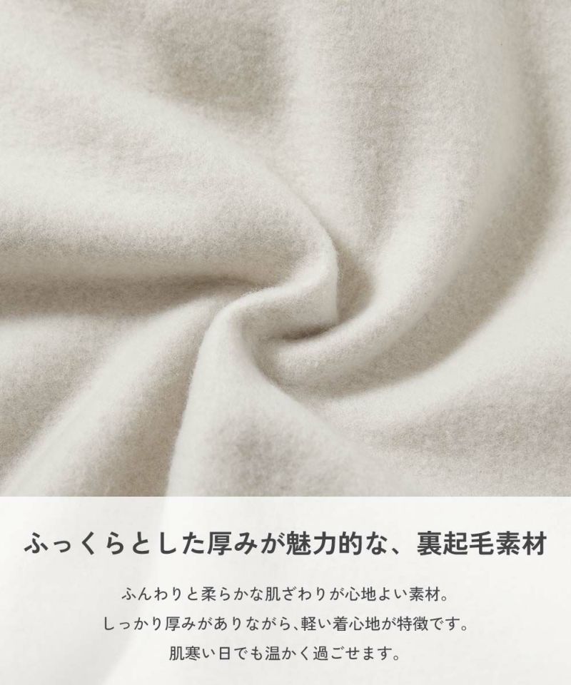 ふっくらとした厚みが魅力的な、裏起毛素材 ふんわりと柔らかな肌ざわりが心地よい素材。 しっかり厚みがありながら、軽い着心地が特徴です。 肌寒い日でも温かく過ごせます。 伸縮性:ふつう