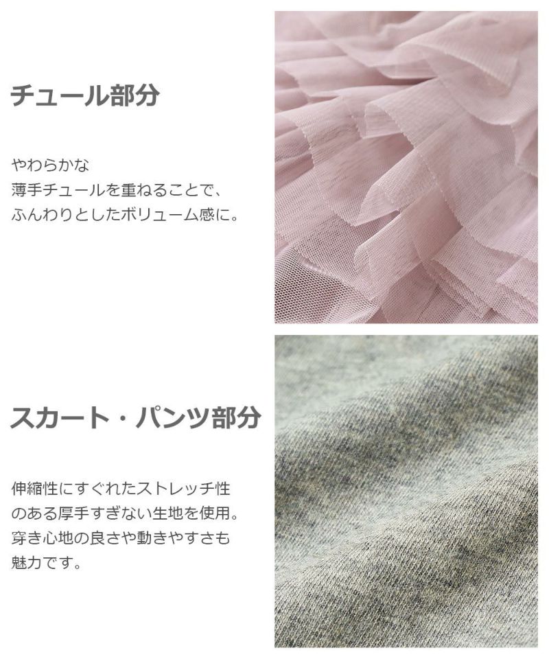 ふんわり広がるチュチュはコーデのアクセントになり、女の子らしさを演出してくれます。 合わせ方次第でカジュアルからフェミニンまで幅広い着こなしフィットする優秀アイテムです。