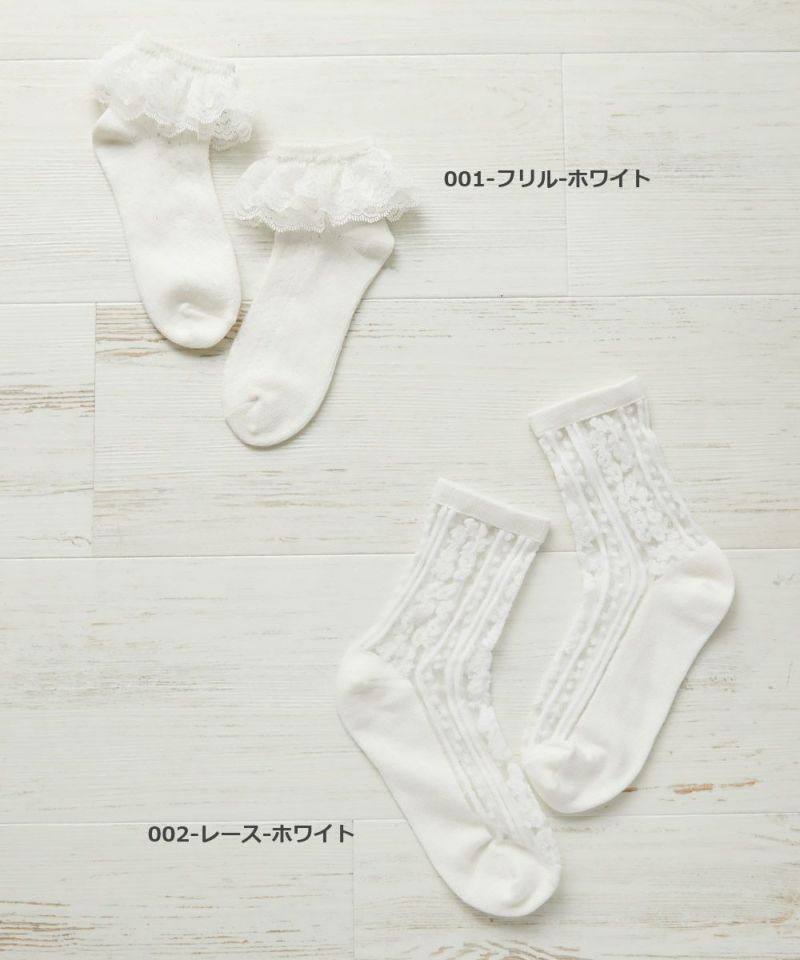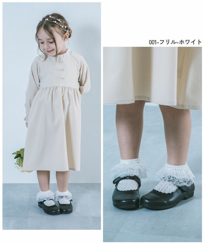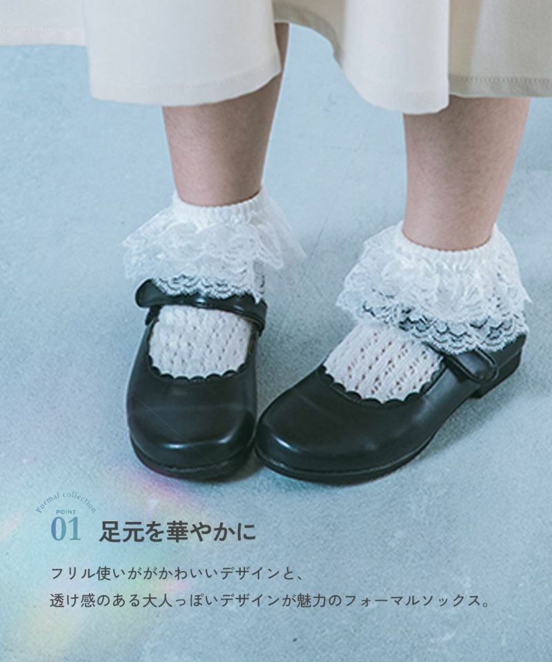 フリル使いががかわいいデザインと、透け感のある大人っぽいレースデザインが魅力のフォーマルソックス。 別ページで販売しているフォーマルバレエシューズ(品番:161GSH001)とセットで着用するのもおすすめです。
