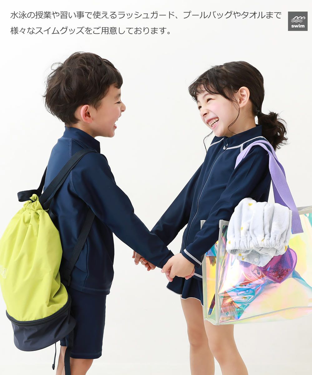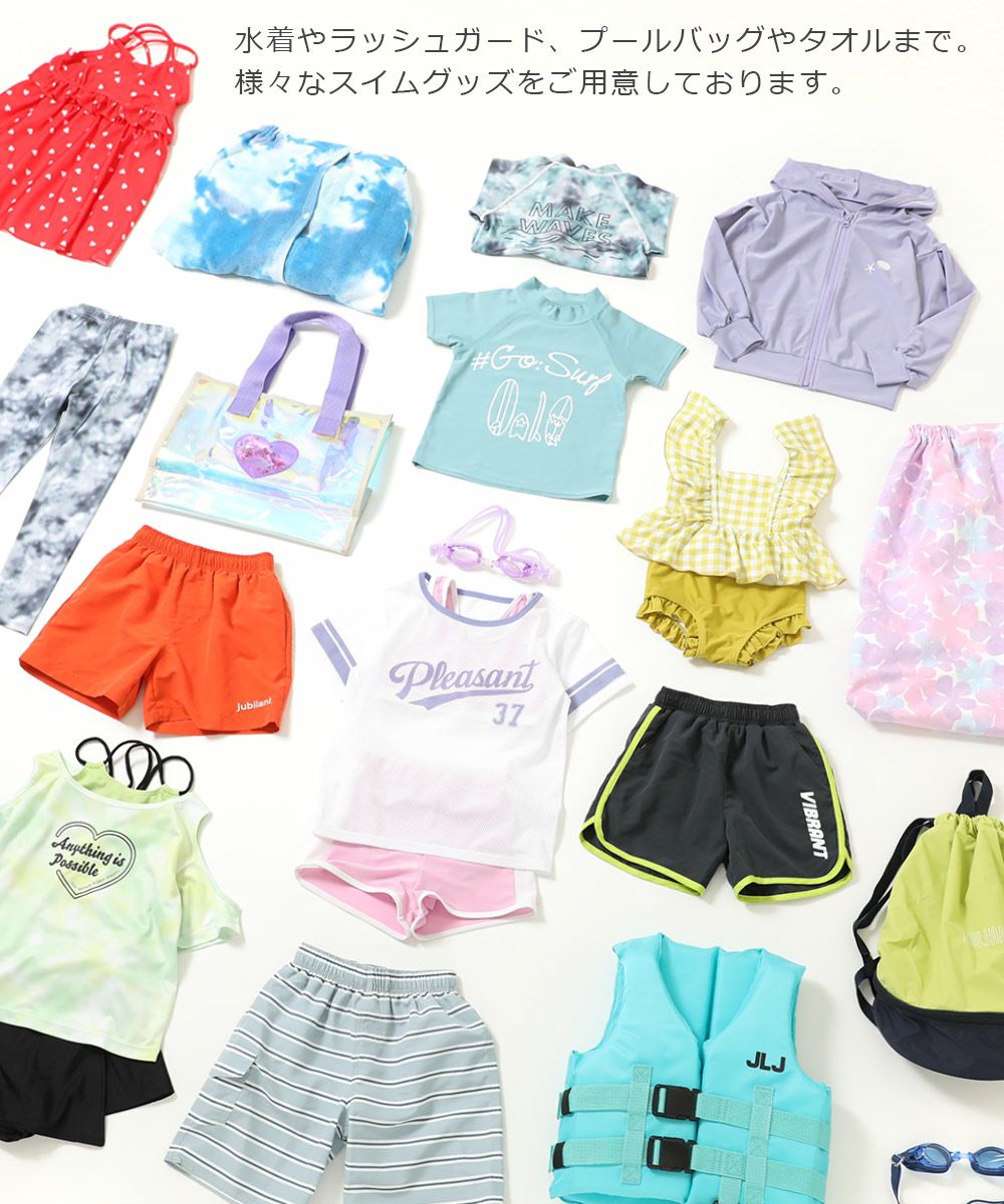 学校や習いごとにピッタリのスクール水着からレジャー用のサーフパンツやワンピース水着、UVカット機能のついたラッシュガードやお着替え時のマストアイテム、ラップタオルなど、海やプールで大活躍のアイテムをそろえています。