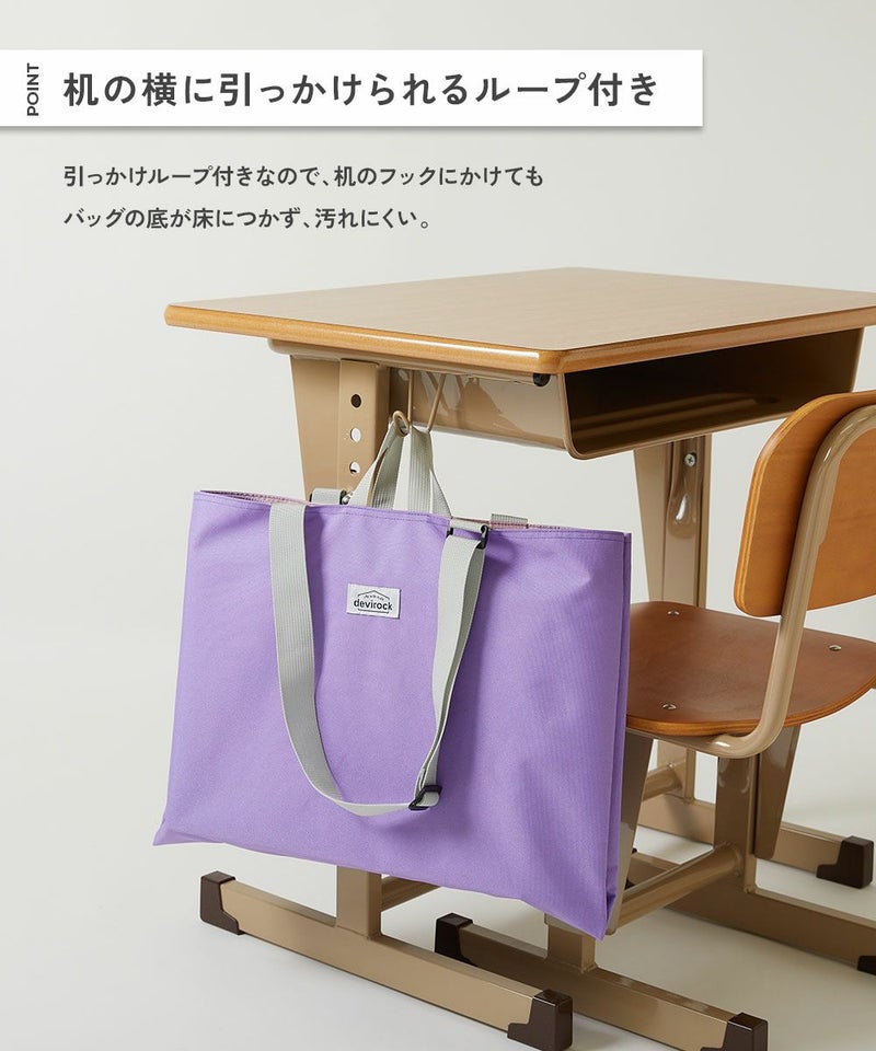 付属の肩紐を調整すれば、ショルダーとトート2WAYで使用できるのもポイント。 引っかけループ付きなので、机の横にかけても、バッグの底が床につかず、汚れにくくなっています。