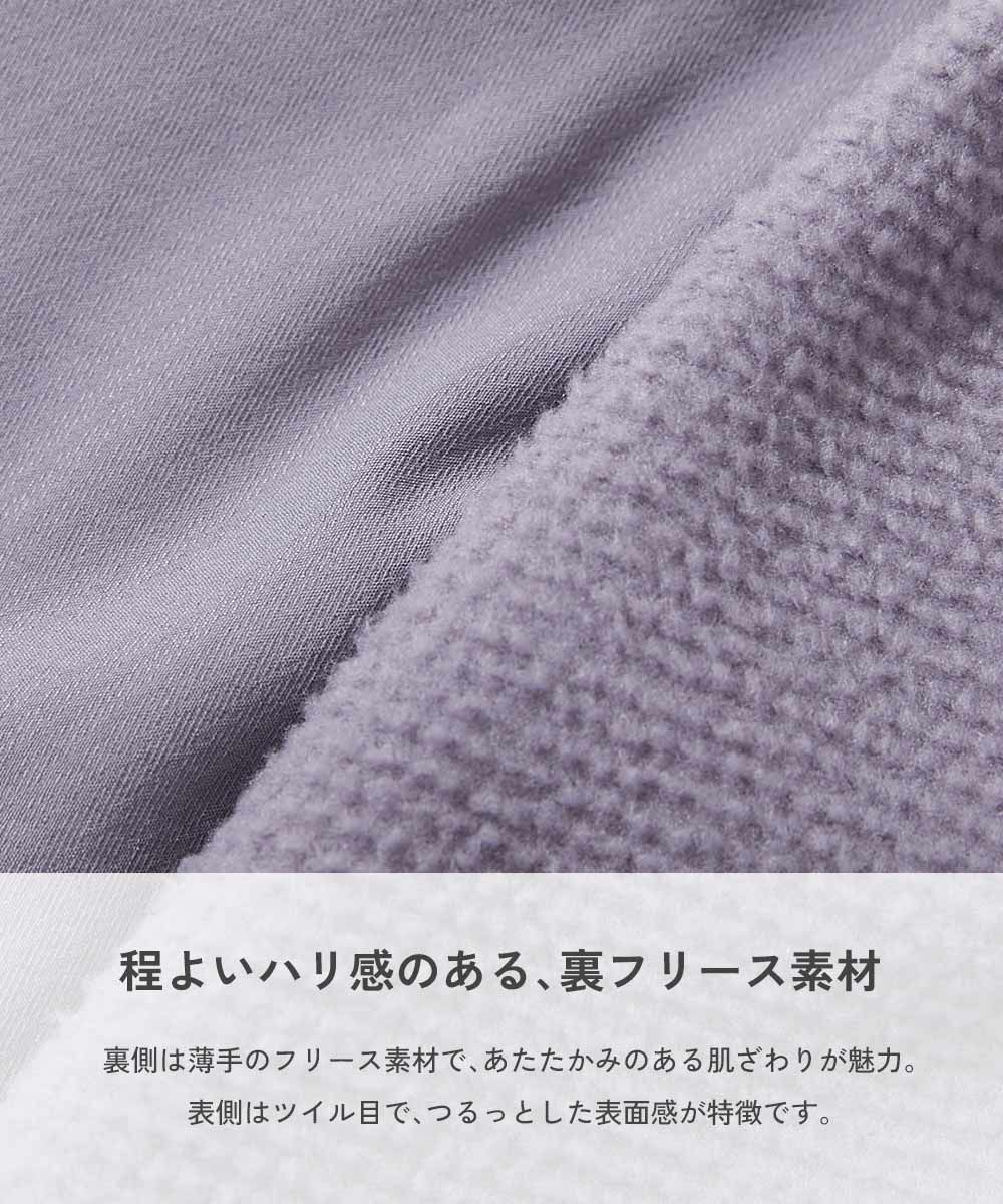 程よいハリ感のある、裏フリース素材 裏側は薄手のフリース素材で、あたたかみのある肌ざわりが魅力。 表側はツイル目で、つるっとした表面感が特徴です。 伸縮性:なし