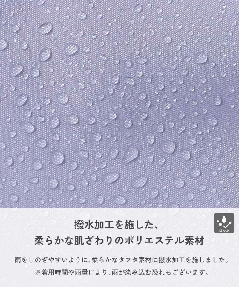 撥水加工を施した、柔らかな肌ざわりのポリエステル素材 雨をしのぎやすいように、柔らかなタフタ素材に撥水加工を施しました。 ※着用時間や雨量により、雨が染み込む恐れもございます。