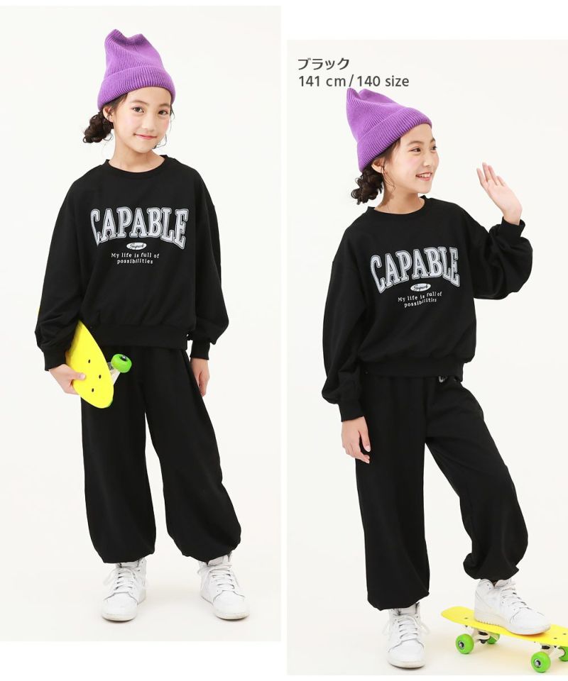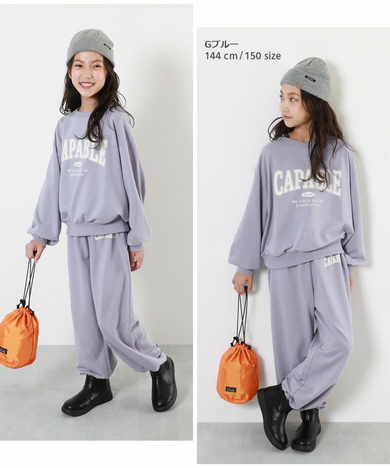 ゆるっとかわいい『【普段着でもルームウェアでも】ガールズ ミニ裏毛 カレッジロゴ セットアップ』