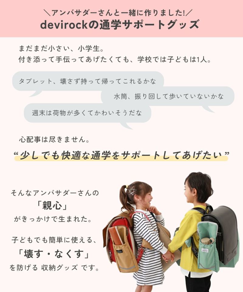 devirock(デビロック)公式オンラインストアでは、 通学に必要なスクールアイテムをまとめて選べるだけでなく、 成長に合わせてサイズを選べるので、 入学準備や新学期の買い替え、兄弟姉妹分のまとめ買いにもおすすめです。