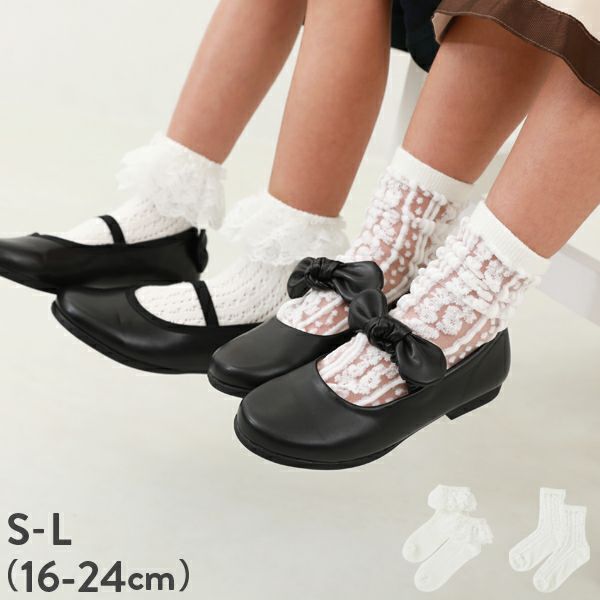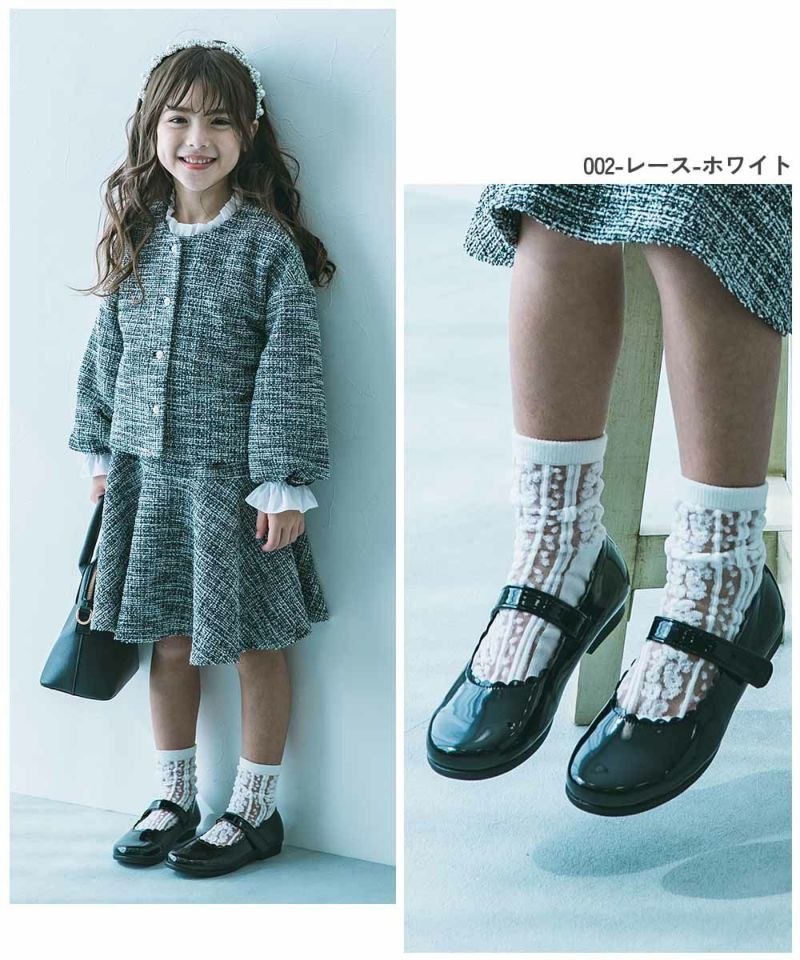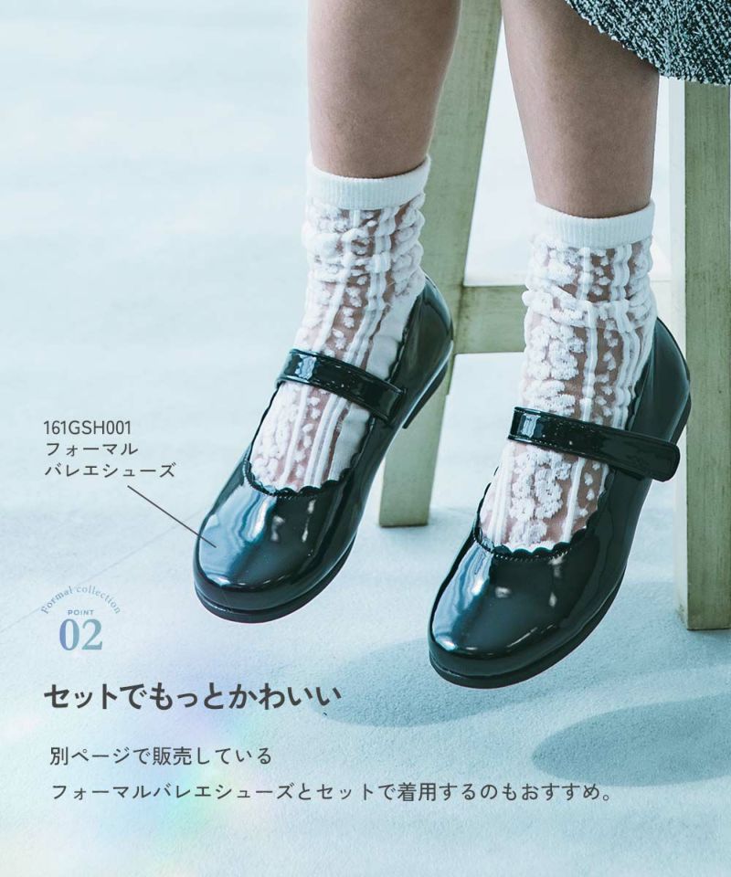 フリル使いががかわいいデザインと、透け感のある大人っぽいレースデザインが魅力のフォーマルソックス。 別ページで販売しているフォーマルバレエシューズ(品番:161GSH001)とセットで着用するのもおすすめです。