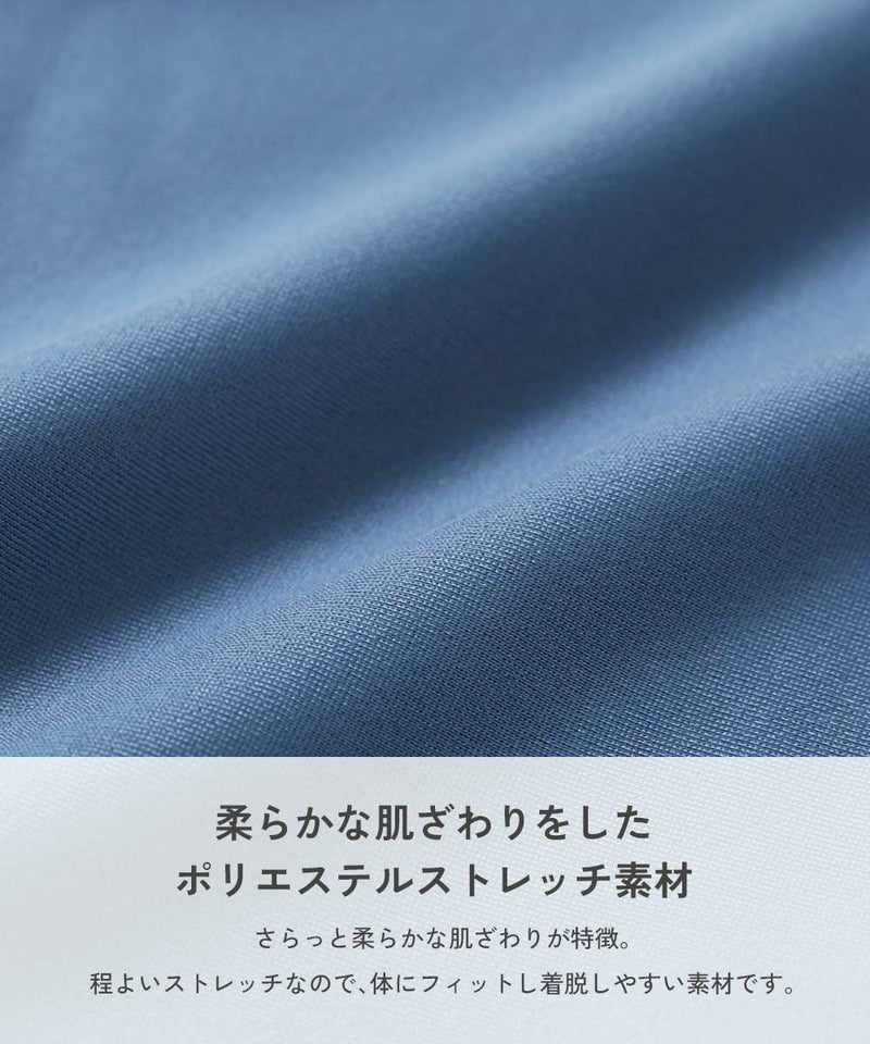 柔らかな肌ざわりをしたポリエステルストレッチ素材 さらっと柔らかな肌ざわりが特徴。 程よいストレッチなので、体にフィットし着脱しやすい素材です。 伸縮性:あり